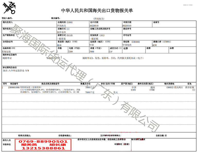 饲料添加剂出口报关手续还是比较麻烦的,特别是出口东南亚国家,尤其是越南,清关时也有特殊的要求,如果前期资料处理不当,货物抵港后,很有可能会出现无法清关而退运的风险,近期聚海小编就协助重庆某客户处理了一批深圳蛇口港报关出口的饲料添加剂,在客户资料不完整的情况下,顺利将期7吨多货完成越南海防港清关,避免了退运的风险,帮客户挽回了损失.
